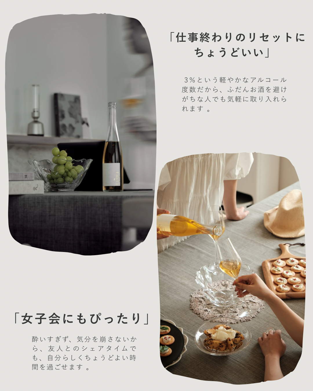 「お酒が飲めない」と諦めていた方も、これならきっと大丈夫。アルコール度数3%という優しい設計と、アルコール感をほとんど感じさせない飲みやすさで、まるで上質なフルーツジュースを飲んでいるかのよう。でも、ちゃんと「お酒を楽しんでいる」という特別な高揚感と、乾杯の輪に加われる喜びを体感できます。